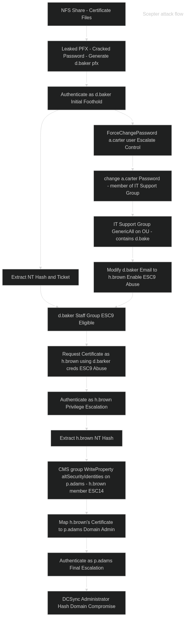 This is my comprehensive walkthrough for solving Scepter, a challenging Active Directory machine on Hack The Box. This box required in-depth enumeration, methodical abuse of Active Directory Certificate Services ADCS, and chaining multiple privilege escalation paths across ADCS misconfigurations, ACL abuse, and classic Active Directory attacks.