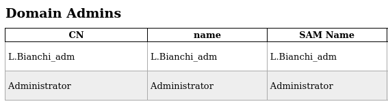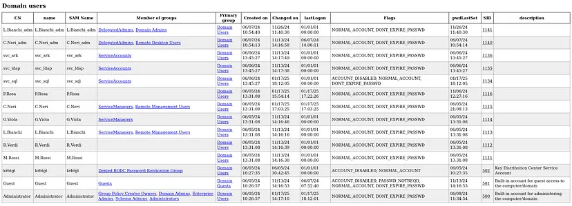 L.Bianchi_admand Administrator, both members of the Domain Admins group with passwords set to never expire, making them high-value targets for privilege escalation. Additionally, the userC.Neri_ad, found under the DelegatedAdmins group, may also be a valuable target for further exploitation.