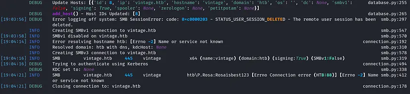 While running the tool in the debug mode If found a domain resolution issue when using vintage.htb